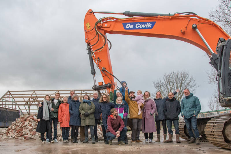 Onze groep erfdelers, januari 2023, op het achtererf terwijl de sloop van de schuren plaatsvindt. V.l.n.r.: