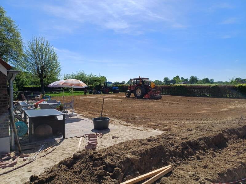 De tuin van de boerderij was al een tijd een knollenveld, omdat daar de leidingen van de grondwarmteinstallatie in geboord en gegraven waren. Eindelijk komen we eraan toe om de voortuin te laten egaliseren en opnieuw in te zaaien. Het werk was amper klaar of er strandde een verdwaasde pakketbezorger met zijn busje in de voortuin, met de voorwielen tot aan de as in de zachte grond. 'Ik dacht dat dit de oprit was...' stamelde hij.