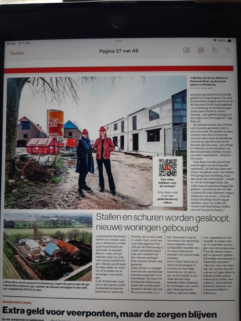 De krant De Gelderlander wijdt een artikel aan ons project. Het wordt een leuk stuk, met als titel 'Boerderij zoekt bewoners'. Het levert veel positieve reacties op, ook uit de buurt.